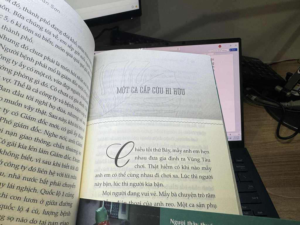 Hôm nay tôi mời anh đi ăn, nhân đó, tặng anh cuốn Tiếng hát trong phòng mổ Tập 2, trong đó có bài viết về anh. Câu chuyện tôi viết về anh trong cuốn Tiếng hát trong phòng mổ Tập 2 mang tên “Một ca cấp cứu hi hữu”, ở trang 71. Xin trích một đoạn: